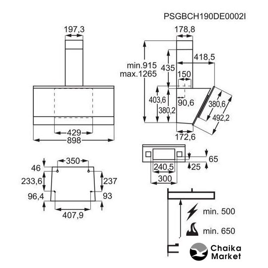 конструкция Т-образная, монтаж настенный, ширина 89.8 см, управление сенсорное, производительность вытяжки 480 м³/ч, цвет нержавеющая сталь/черный