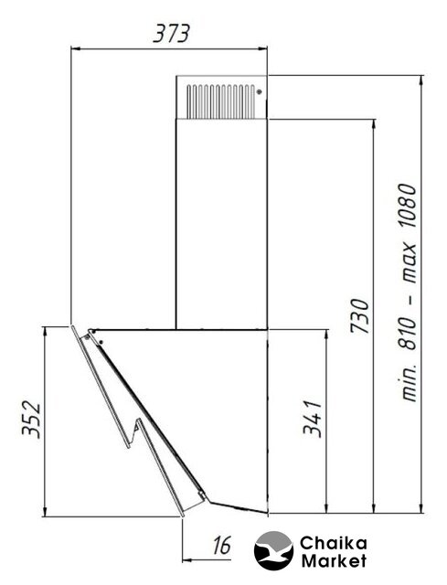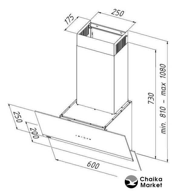 конструкция наклонная, монтаж настенный, ширина 59.8 см, управление механическое/кнопочное, производительность вытяжки 375 м³/ч, цвет черный