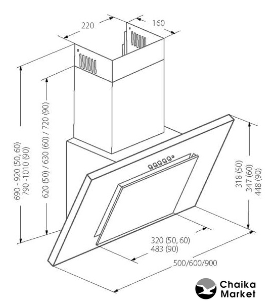 конструкция наклонная, монтаж настенный, ширина 59.6 см, управление механическое/кнопочное, производительность мотора 840 м³/ч, цвет черный