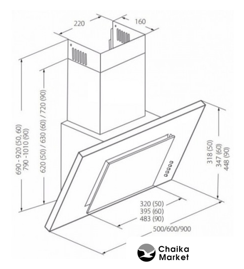 конструкция наклонная, монтаж настенный, ширина 59.6 см, управление механическое/кнопочное, производительность мотора 840 м³/ч, цвет черный