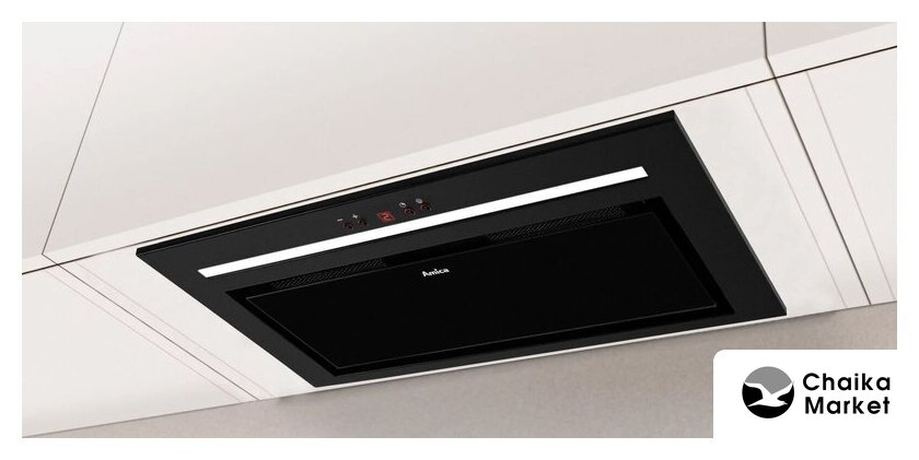 конструкция наклонная, монтаж настенный, ширина 90 см, управление сенсорное, производительность вытяжки 650 м³/ч, цвет черный