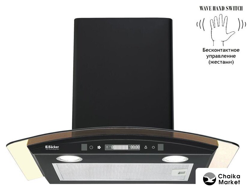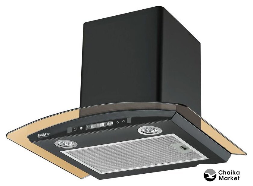 конструкция наклонная, монтаж настенный, ширина 59 см, управление механическое/кнопочное, производительность мотора 430 м³/ч, цвет черный