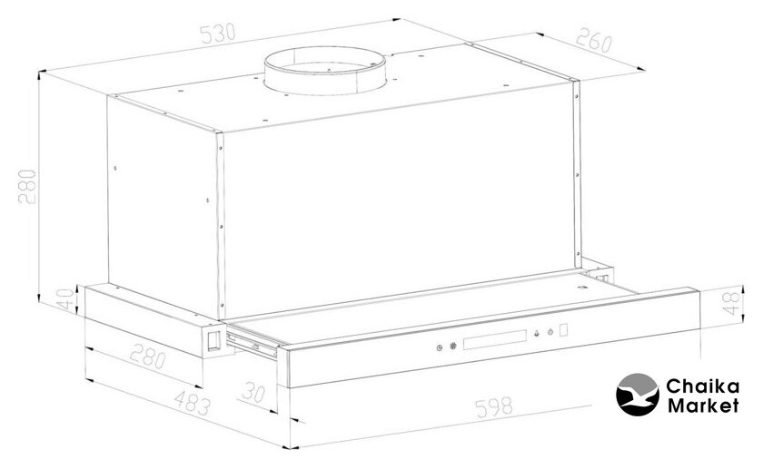 конструкция коробчатая, монтаж настенный, ширина 40 см, управление механическое/кнопочное, производительность мотора 700 м³/ч, цвет белый