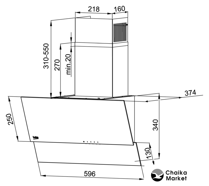 конструкция наклонная, монтаж настенный, ширина 59.5 см, управление сенсорное, производительность вытяжки 650 м³/ч, цвет белый/нержавеющая сталь