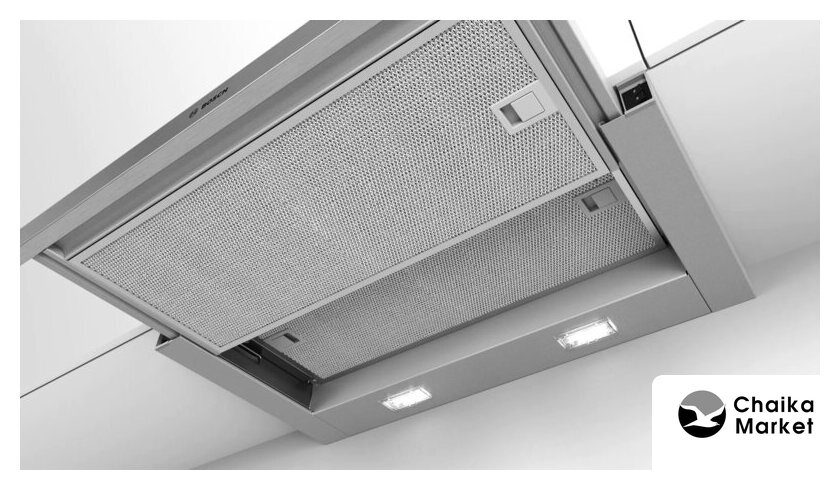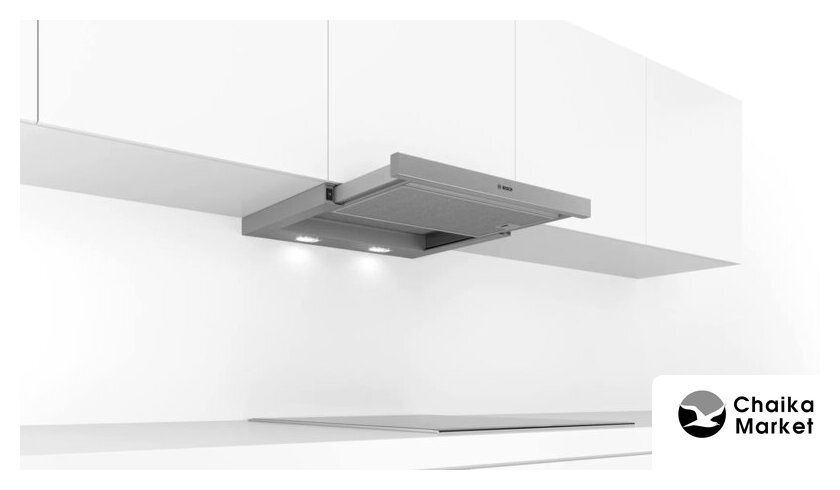 конструкция телескопическая, монтаж для встраивания, ширина 59.8 см, управление механическое/кнопочное, производительность вытяжки 600 м³/ч, цвет серый