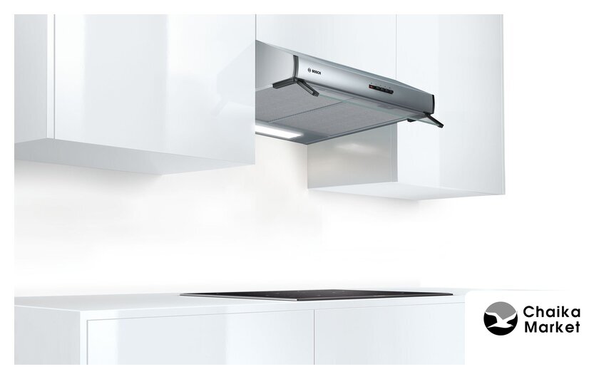 конструкция телескопическая, монтаж для встраивания, ширина 59.8 см, управление механическое/кнопочное, производительность вытяжки 410 м³/ч, цвет белый