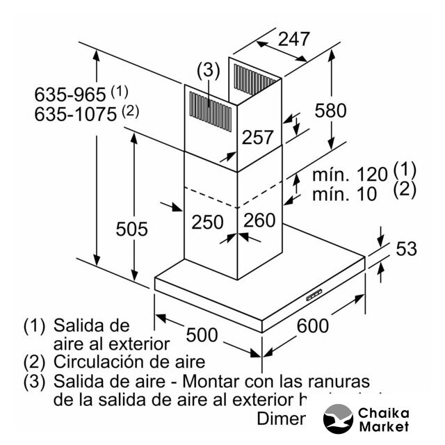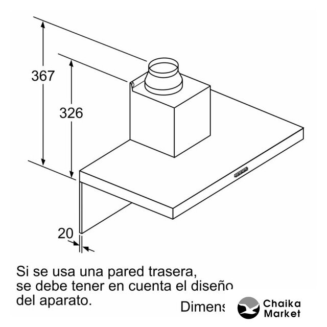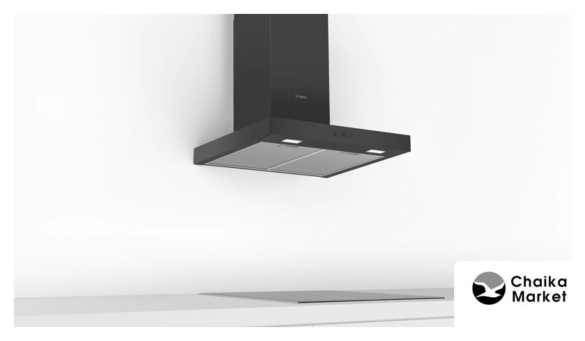 конструкция Т-образная, монтаж настенный, ширина 60 см, управление сенсорное, производительность вытяжки 584 м³/ч, производительность мотора 1200 м³/ч, цвет нержавеющая сталь/черный