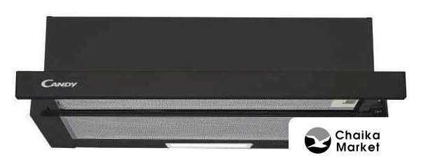 конструкция телескопическая, монтаж для встраивания, ширина 59.8 см, управление кнопочное/механическое, производительность вытяжки 392 м³/ч, цвет черный