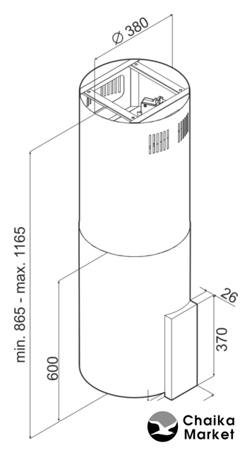 конструкция Т-образная, монтаж настенный, ширина 59.8 см, управление поворотный переключатель, производительность вытяжки 620 м³/ч, производительность мотора 900 м³/ч, цвет черный