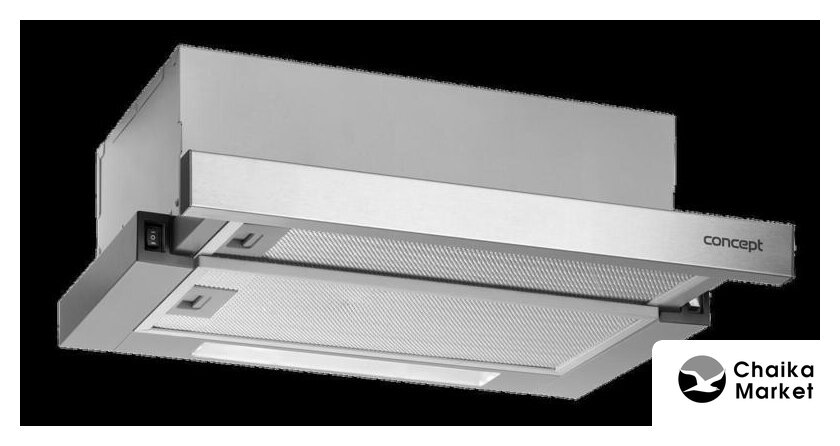 конструкция наклонная, монтаж настенный, ширина 59.6 см, управление механическое/кнопочное, производительность мотора 500 м³/ч, цвет белый