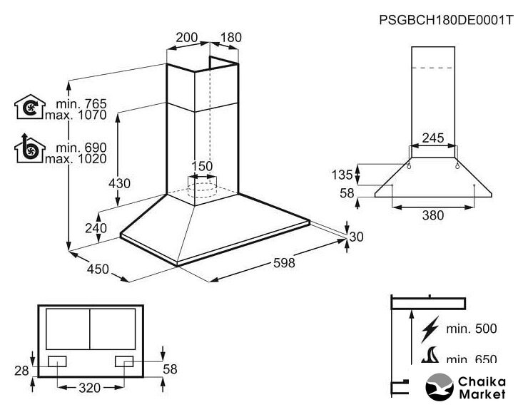 конструкция Т-образная, монтаж настенный, управление электронное/кнопочное, производительность мотора 950 м³/ч, ширина 89.8 см