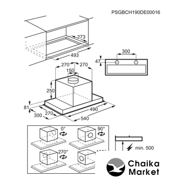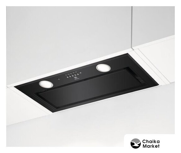 конструкция скрытая, монтаж настенный/для встраивания, ширина 54 см, управление электронное/кнопочное, производительность вытяжки 580 м³/ч, цвет черный