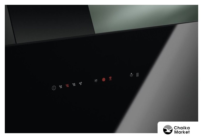 конструкция наклонная, монтаж настенный, ширина 60 см, управление сенсорное, производительность вытяжки 740 м³/ч, цвет черный