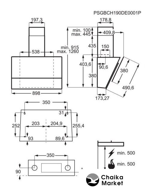 конструкция наклонная, монтаж настенный, ширина 89.8 см, управление сенсорное, производительность вытяжки 460 м³/ч, цвет черный