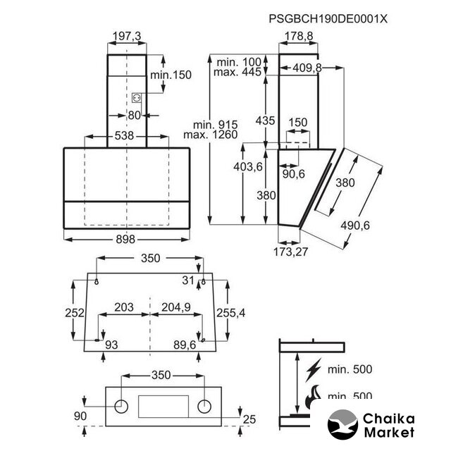 конструкция Т-образная, монтаж настенный, ширина 119.8 см, управление электронное/кнопочное, производительность вытяжки 610 м³/ч, цвет черный