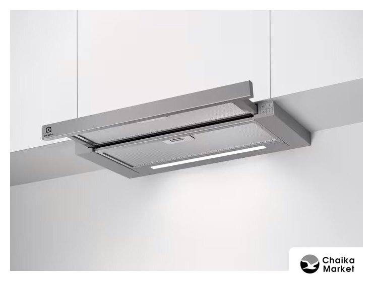 конструкция телескопическая, монтаж для встраивания, ширина 59.8 см, управление механическое/кнопочное, производительность вытяжки 388 м³/ч, цвет серебристый