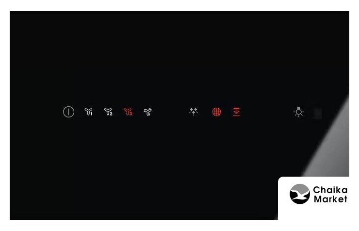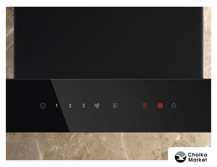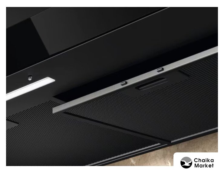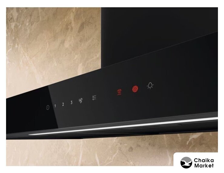 конструкция наклонная, монтаж настенный, ширина 70 см, управление сенсорное, производительность вытяжки 584 м³/ч, цвет черный