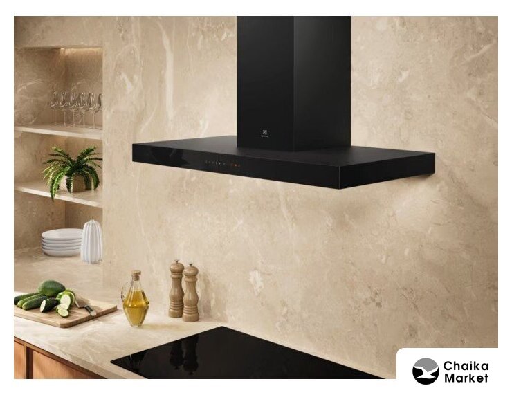 конструкция Т-образная, монтаж настенный, ширина 90 см, управление механическое/кнопочное, производительность вытяжки 619 м³/ч, цвет черный