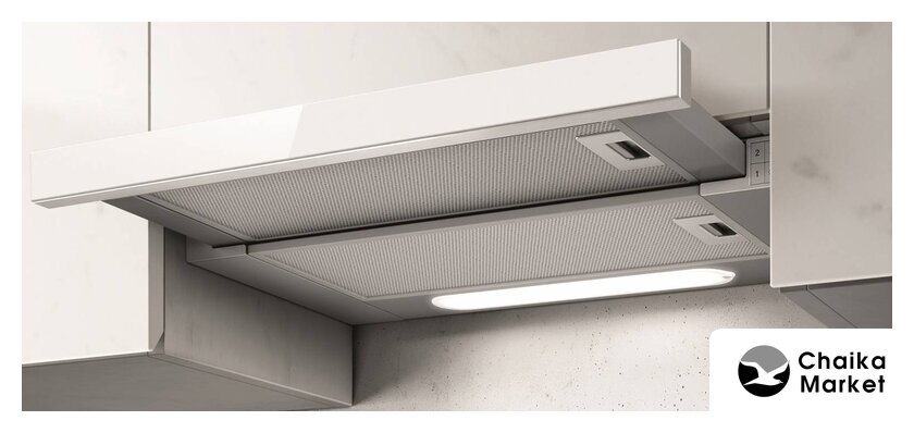 конструкция купольная, монтаж настенный, ширина 59.8 см, управление механическое/кнопочное, производительность мотора 800 м³/ч, цвет белый