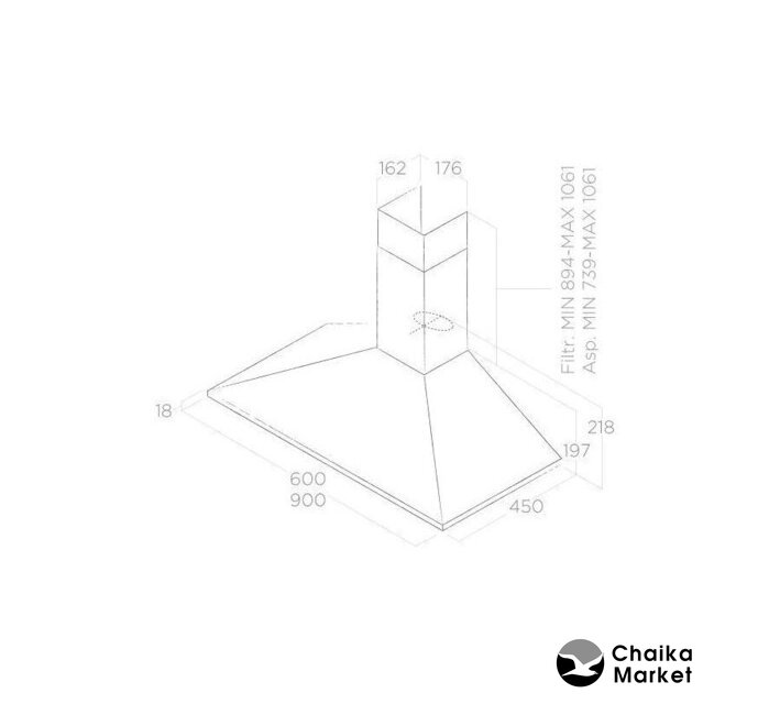 конструкция коробчатая, монтаж настенный, ширина 35 см, управление электронное/кнопочное, производительность мотора 1050 м³/ч, цвет белый