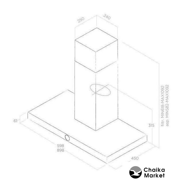 конструкция купольная, монтаж настенный, управление механическое/слайдерное, производительность мотора 595 м³/ч, ширина 90 см