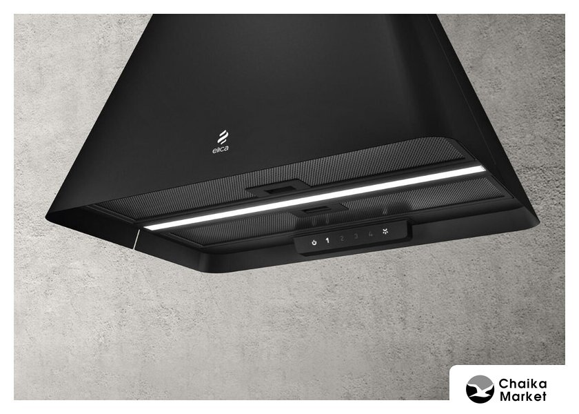 конструкция коробчатая, монтаж островной, ширина 35 см, управление электронное/кнопочное, производительность мотора 800 м³/ч, цвет черный