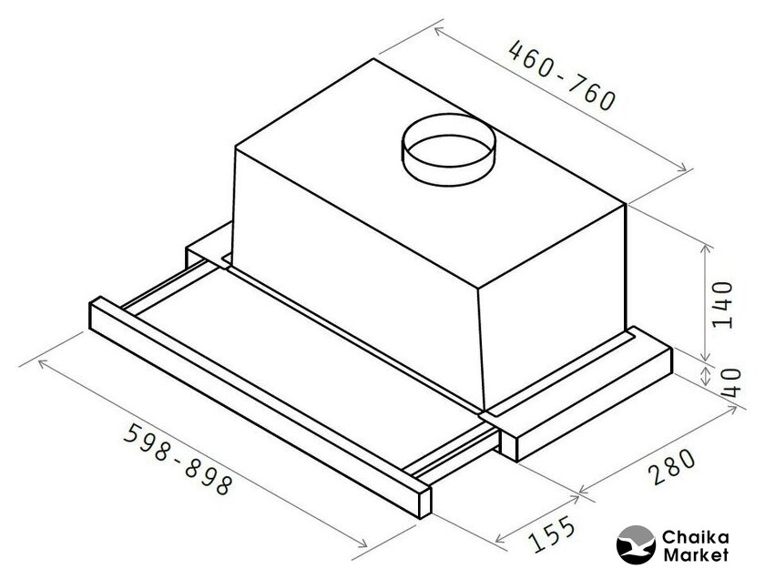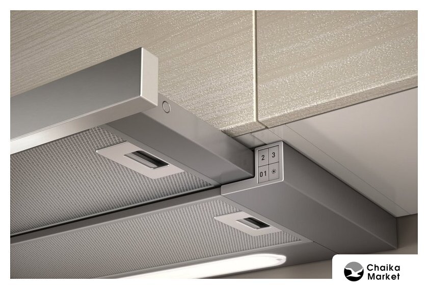 конструкция скрытая, монтаж для встраивания, ширина 59.8 см, управление механическое/кнопочное, производительность мотора 1050 м³/ч, цвет белый