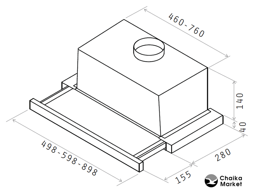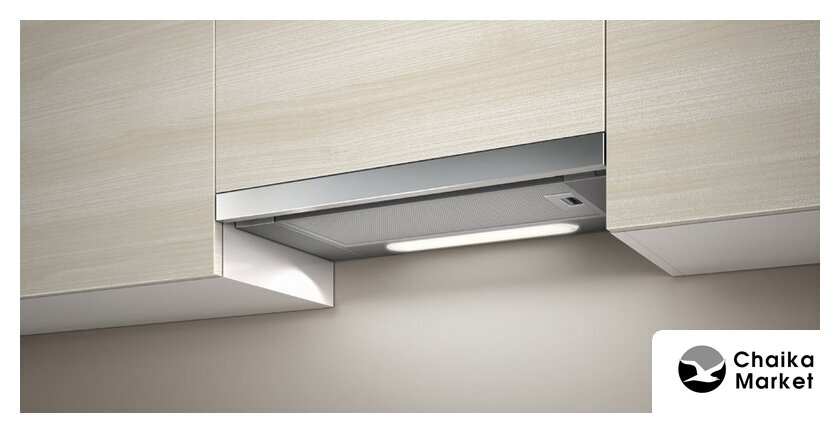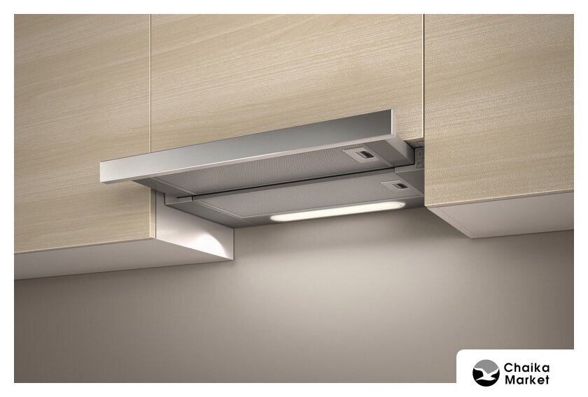 конструкция телескопическая, монтаж для встраивания, управление механическое/кнопочное, производительность мотора 650 м³/ч, ширина 59.8 см