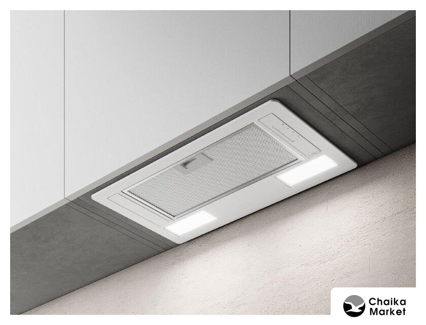 конструкция скрытая, монтаж для встраивания, ширина 70 см, управление электронное/кнопочное, производительность мотора 1000 м³/ч, цвет белый