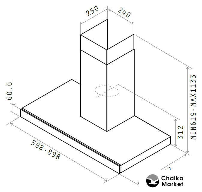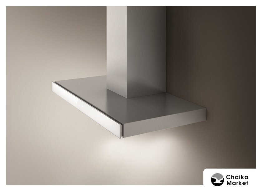конструкция Т-образная, монтаж настенный, ширина 89.8 см, управление сенсорное, производительность вытяжки 581 м³/ч, цвет нержавеющая сталь/черный