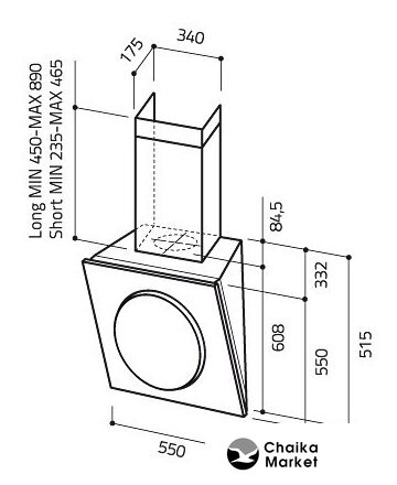 конструкция Т-образная, монтаж островной, ширина 90 см, управление сенсорное, производительность мотора 445 м³/ч, цвет нержавеющая сталь