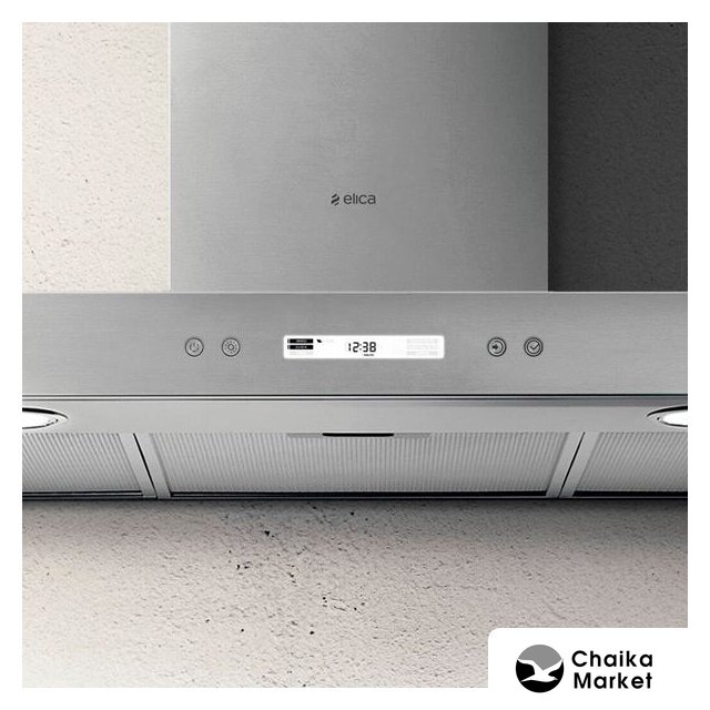 конструкция Т-образная, монтаж настенный, ширина 89.8 см, управление электронное/кнопочное, производительность вытяжки 540 м³/ч, производительность мотора 1200 м³/ч, цвет нержавеющая сталь