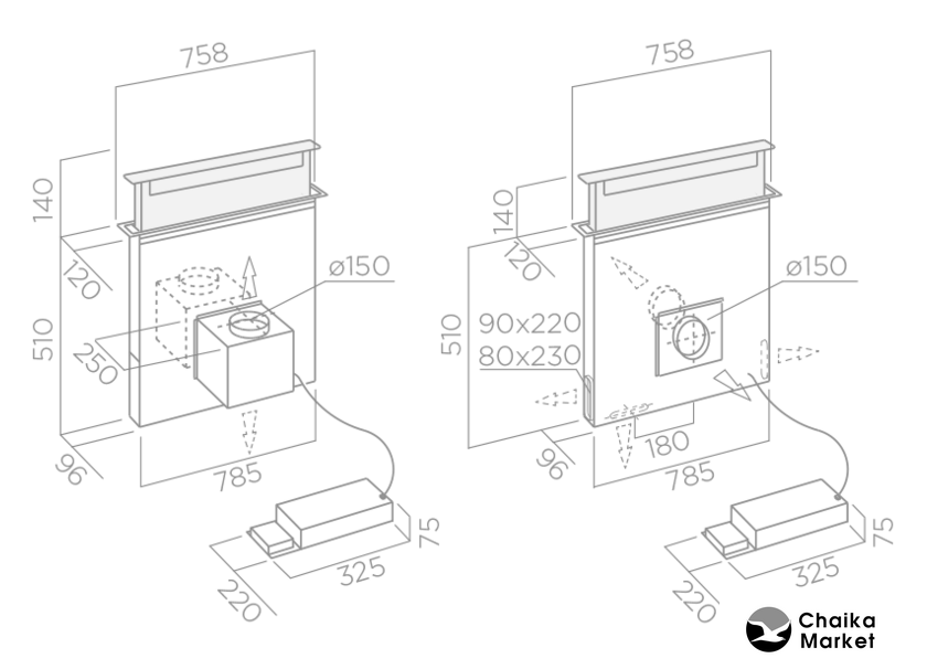 монтаж настенный/островной, управление электронное, производительность мотора 800 м³/ч, ширина 50 см