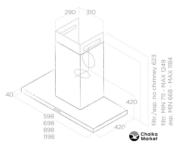 монтаж островной, управление электронное, производительность мотора 800 м³/ч, ширина 35 см