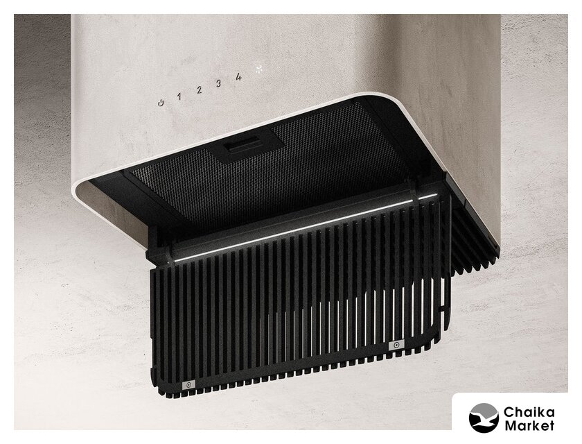 конструкция Т-образная, монтаж настенный, ширина 119.8 см, управление электронное/кнопочное, производительность вытяжки 410 м³/ч, производительность мотора 1200 м³/ч, цвет белый