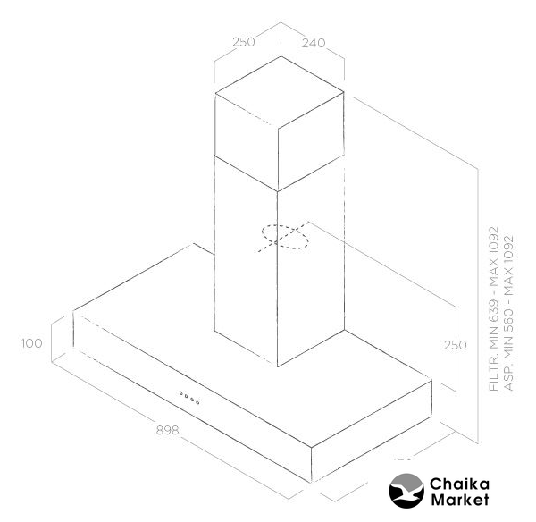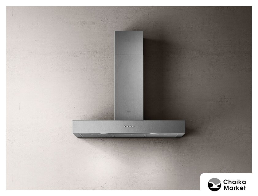 конструкция Т-образная, монтаж настенный, ширина 90 см, управление сенсорное, производительность вытяжки 427 м³/ч, цвет нержавеющая сталь