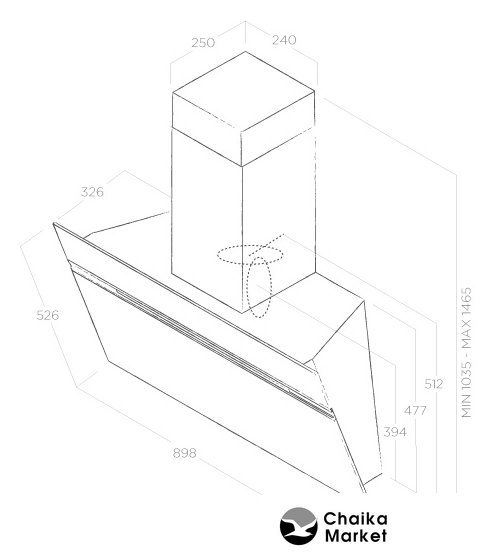 конструкция Т-образная, монтаж настенный, ширина 89.8 см, управление кнопочное, производительность вытяжки 630 м³/ч, производительность мотора 1000 м³/ч, цвет серебристый