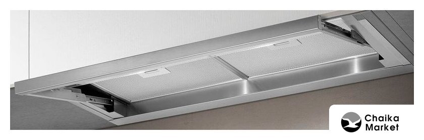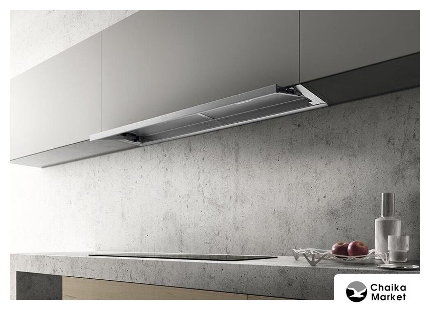 конструкция коробчатая, монтаж островной, ширина 38 см, управление механическое/кнопочное, производительность мотора 1000 м³/ч, цвет нержавеющая сталь