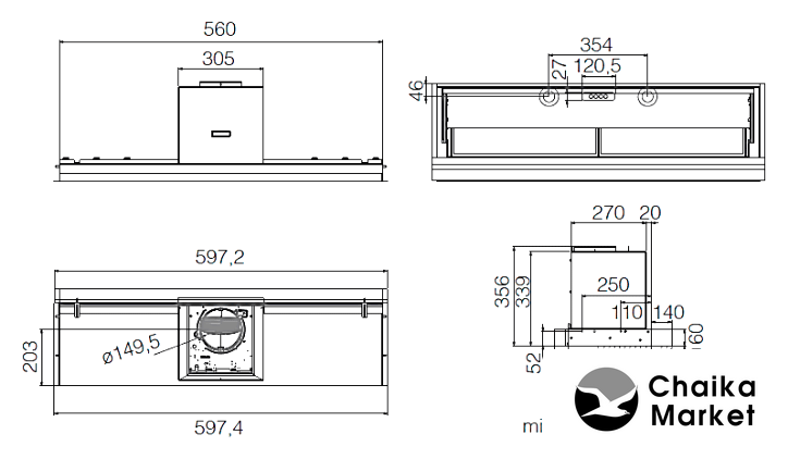 конструкция наклонная, монтаж настенный, ширина 59.8 см, управление сенсорное, производительность мотора 1200 м³/ч, цвет черный