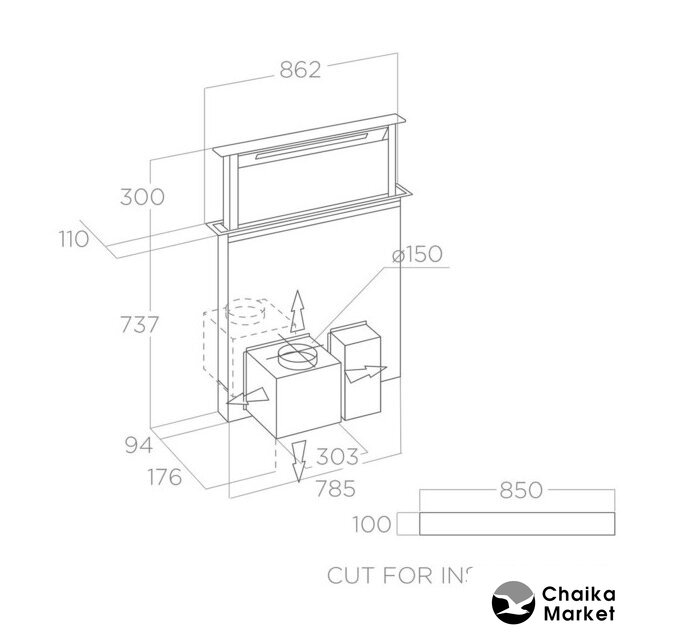 конструкция скрытая, монтаж для встраивания, ширина 100 см, управление дистанционное, производительность вытяжки 465 м³/ч, производительность мотора 1500 м³/ч, цвет белый