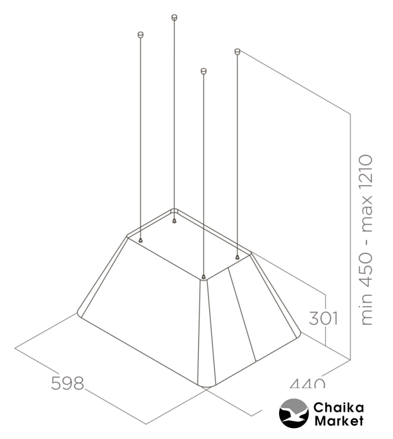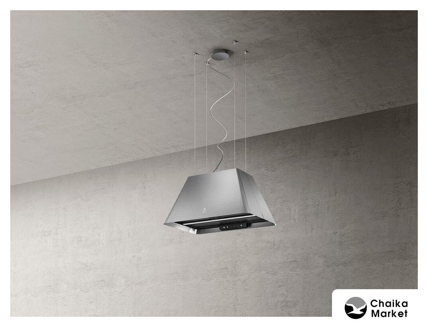 конструкция коробчатая, монтаж островной, ширина 43 см, управление электронное/кнопочное, производительность вытяжки 600 м³/ч, цвет черный