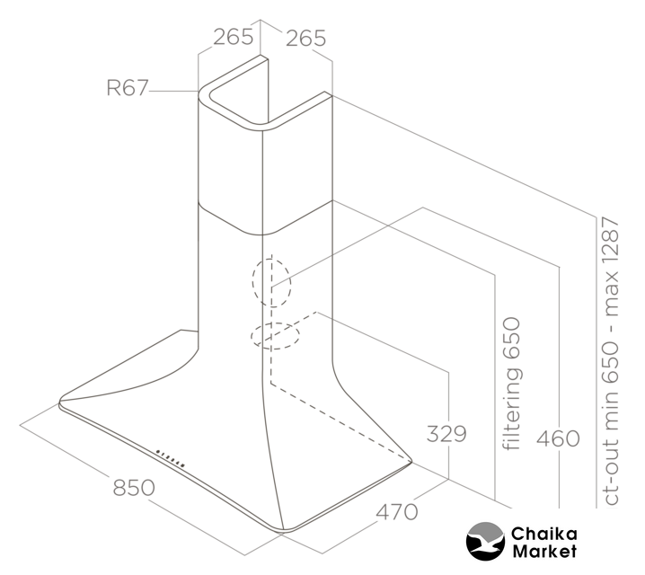 конструкция купольная, монтаж настенный, управление механическое/поворотный переключатель, производительность вытяжки 582 м³/ч, ширина 59.5 см