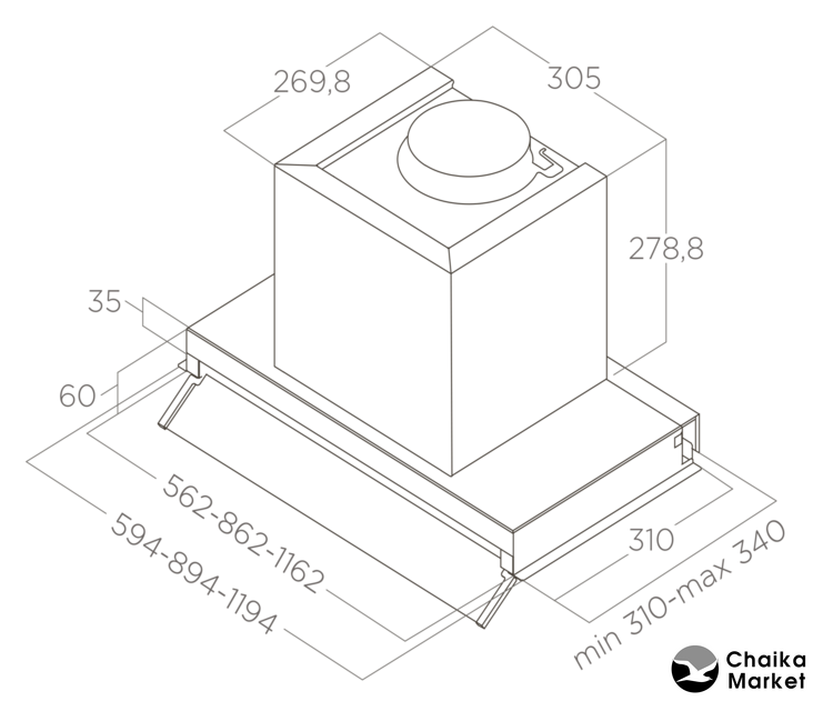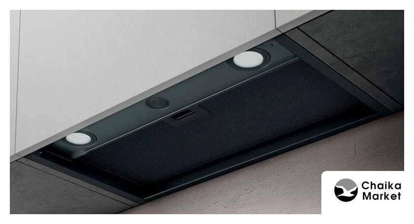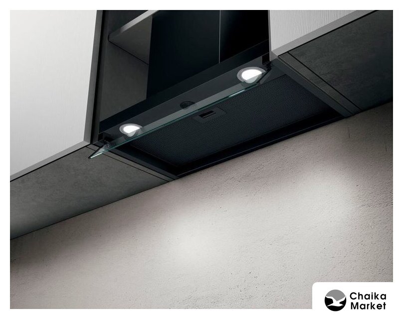 конструкция Т-образная, монтаж настенный, ширина 59.8 см, управление поворотный переключатель, производительность вытяжки 620 м³/ч, производительность мотора 900 м³/ч, цвет черный