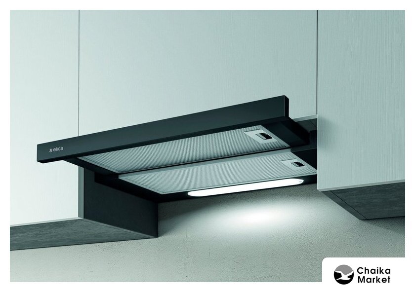 конструкция коробчатая, монтаж настенный, ширина 38 см, управление механическое/кнопочное, производительность мотора 1000 м³/ч, цвет черный