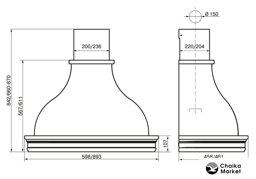 конструкция купольная, монтаж настенный, ширина 89.8 см, управление сенсорное, производительность мотора 800 м³/ч, цвет нержавеющая сталь/черный