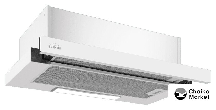 конструкция скрытая, монтаж для встраивания, ширина 59.8 см, управление механическое/кнопочное, производительность мотора 500 м³/ч, цвет белый