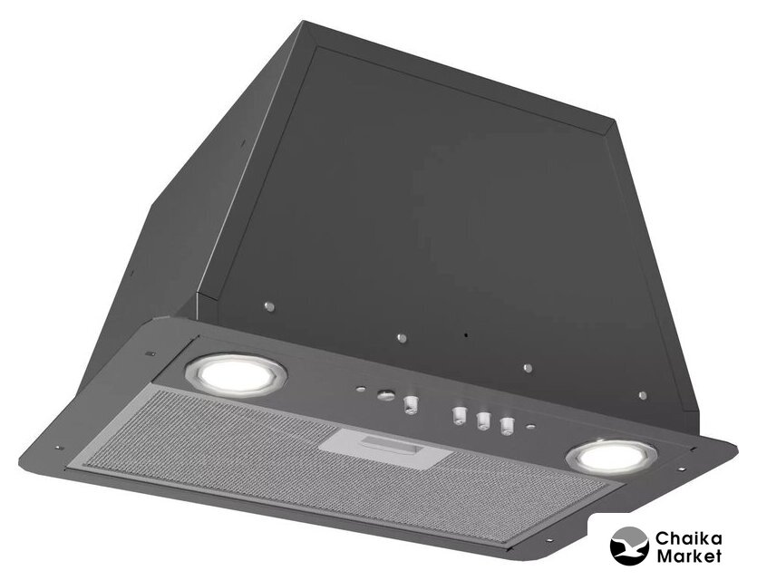 конструкция скрытая, монтаж для встраивания, ширина 52.5 см, управление механическое/кнопочное, производительность мотора 780 м³/ч, цвет черный