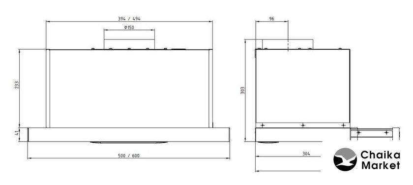 конструкция купольная, монтаж настенный, управление механическое/кнопочное, производительность мотора 500 м³/ч, ширина 50 см