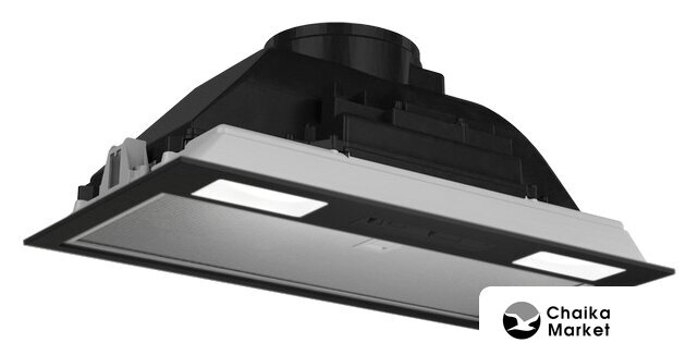 конструкция скрытая, монтаж для встраивания, ширина 59.6 см, управление механическое/кнопочное, производительность мотора 1050 м³/ч, цвет белый
