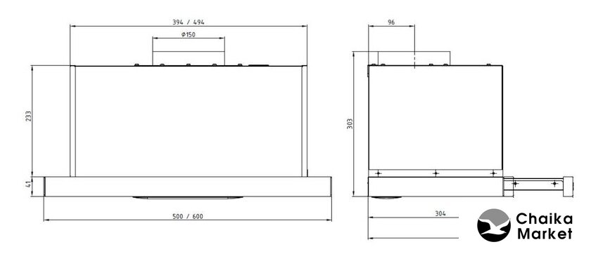 конструкция купольная, монтаж настенный, управление механическое/кнопочное, производительность мотора 500 м³/ч, ширина 50 см